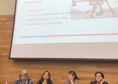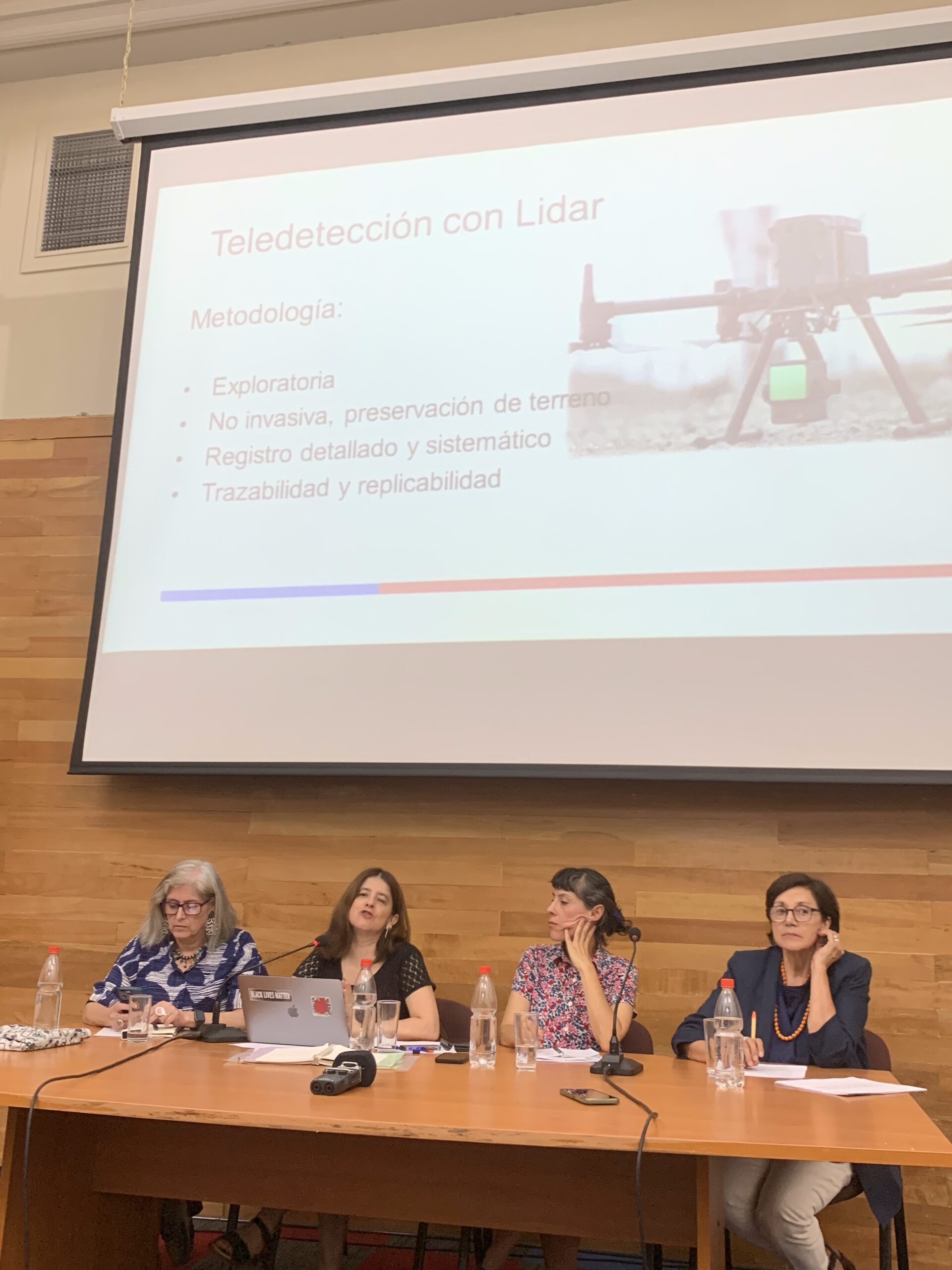 Por su parte, Magdalena Garcés, coordinadora del Plan Nacional de Búsqueda, centró su exposición en cómo la tecnología interdisciplinaria ayuda a enfrentar el desafío del ocultamiento sistemático de cuerpos en el enclave. Se refirió a nuevas herramientas, se ha implementado el uso de drones con tecnología LIDAR (teledetección no invasiva), análisis de fotografías satelitales de los años 60 y sistemas de información geográfica (SIG) para mapear el terreno.