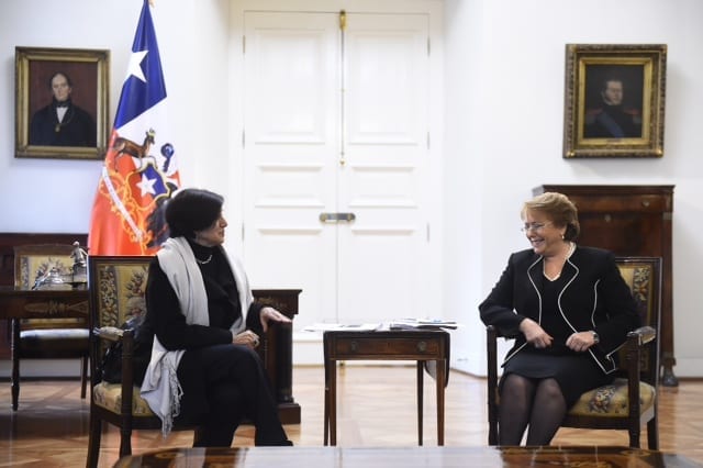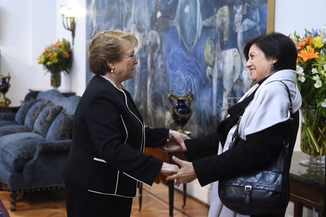 Presidenta Michelle Bachelet junto a Margarita Romero, presidenta de la Asociación por la Memoria y los Derechos Humanos Colonia Dignidad. Imágenes gentileza de la presidencia de la República de Chile